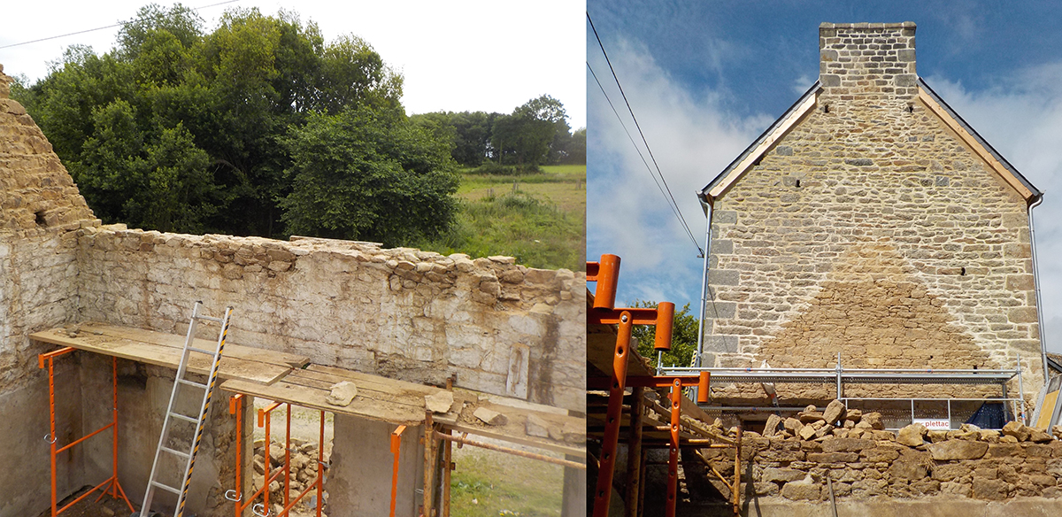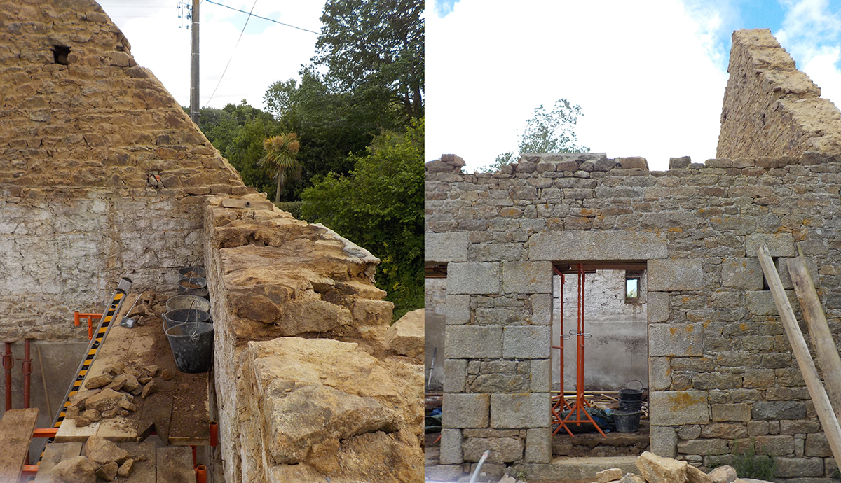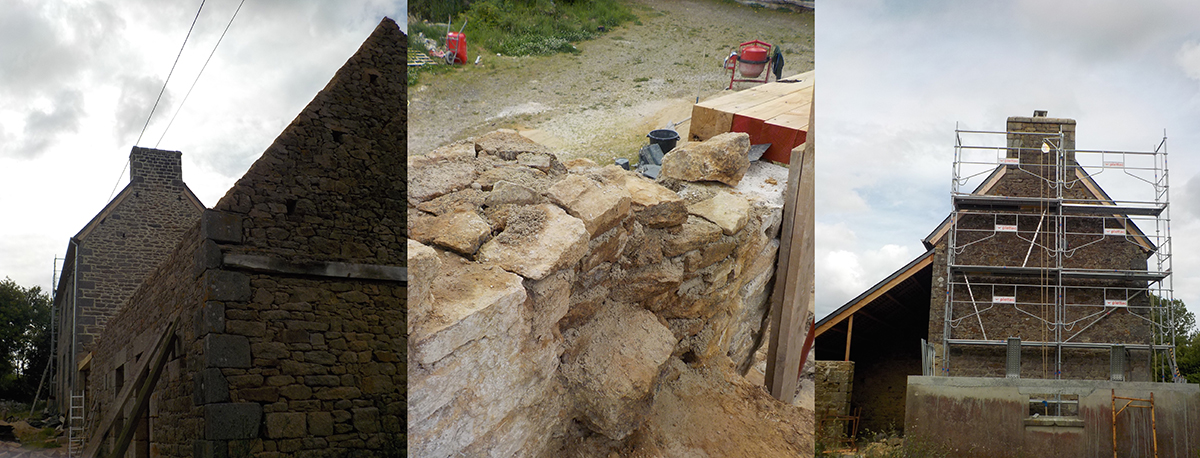 Suite de la maçonnerie sur le haut de mur de la longère, pendant que les maçons terminent les joints sur les rives.
