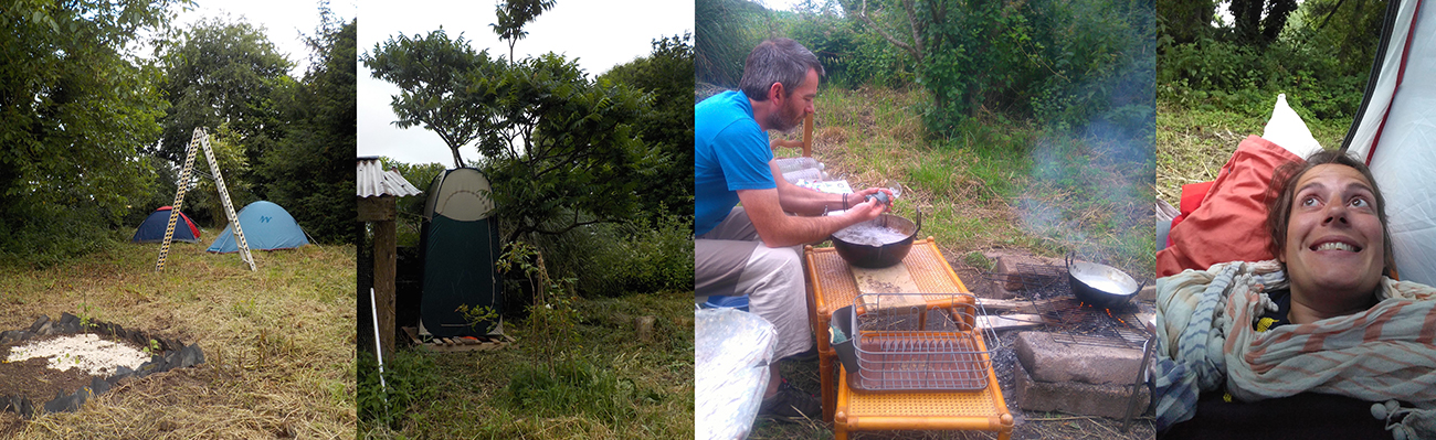 Alors pour accueillir des travailleurs, nous avons installé un camping 5 étoiles ! Quelques tentes, une douche solaire, une quasi installation pour la vaisselle ! Du confort pour travailler à la campagne.