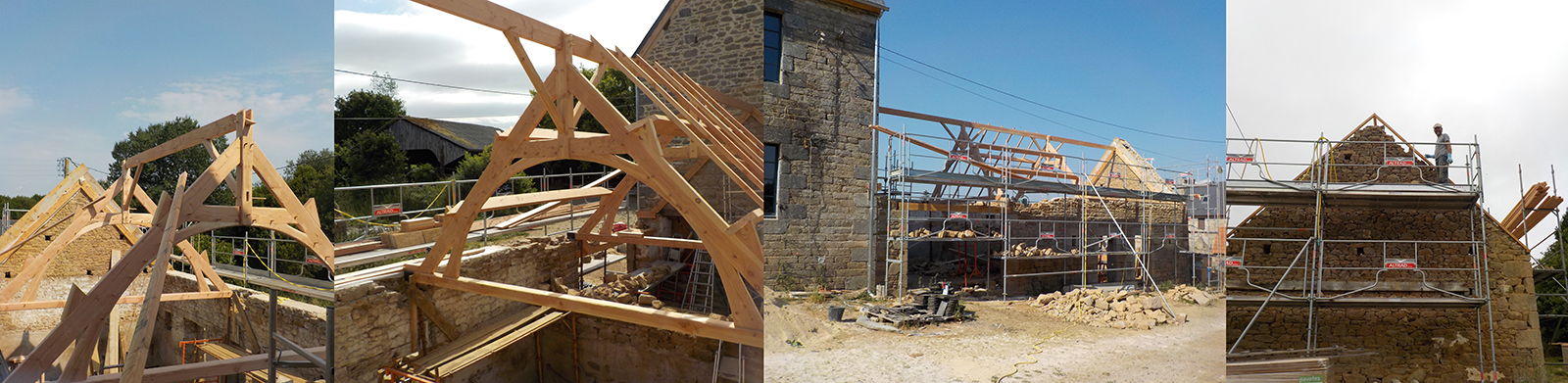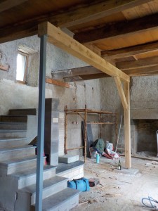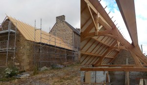 Les fermes apparentes sont arrondies comme nous les avions demandées. Le bois que l’on voit aujourd’hui à l’intérieur de la longère restera apparent.
