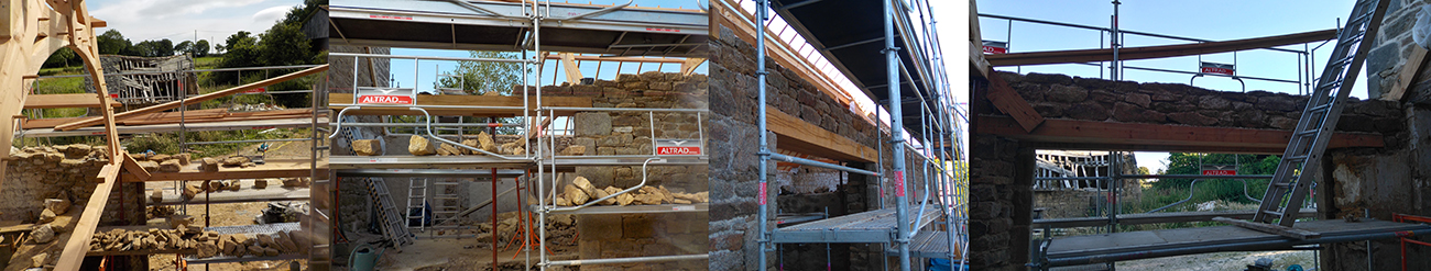Du 20 au 24 juin, pose des fermes, de la pane faîtière, des premiers chevrons et vu sur le pignon Est avec les pierres à remonter.