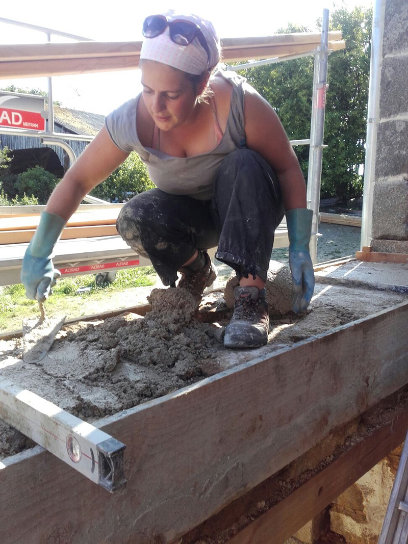 Une fois les pierres posées, nous avons coulé l’arase sur la partie restante du mur Sud. Puis Gwen a bouché le trou qui avait été laissé pour une nichée de moineaux, mais impossible d’attendre plus, il fallait boucher avant la pose du toit.