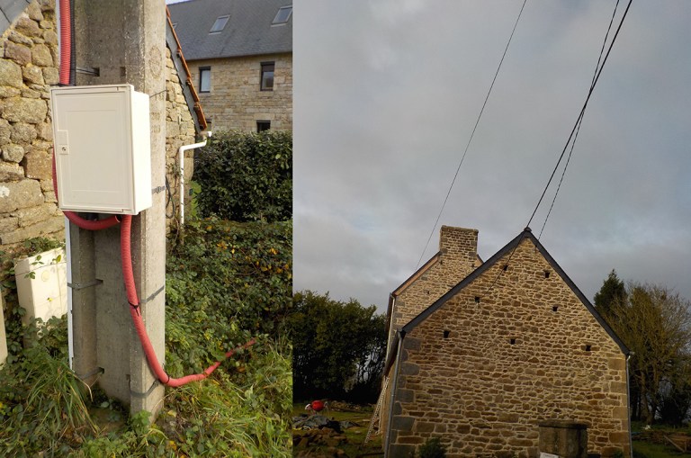 Mais, c’est là que le mais se pose, nous nous sommes alors rendus compte, que le câble arrivait alors juste au sol, de l’autre côté, dans la longère. Un peu court pour nous permettre des branches simples, nous avons donc commandé un nouveau câble pour prolonger le premier.