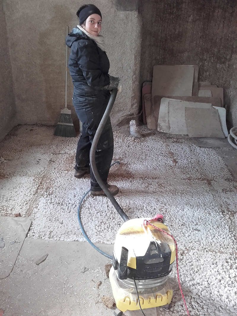 Pour atteindre la dalle, il faut supprimer une bonne couche de poussière, reste de chanvre, …