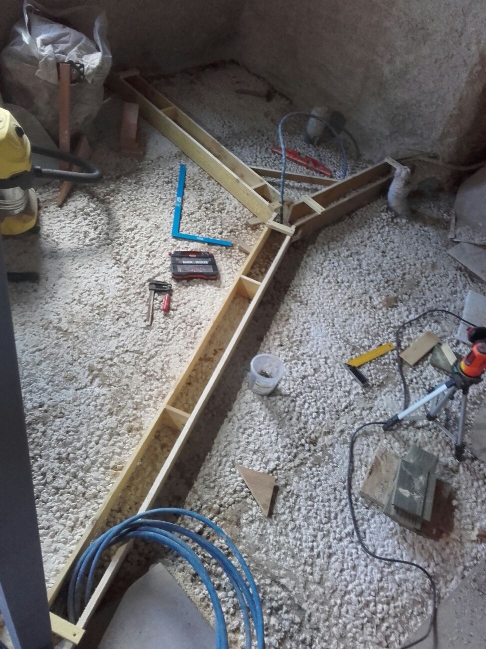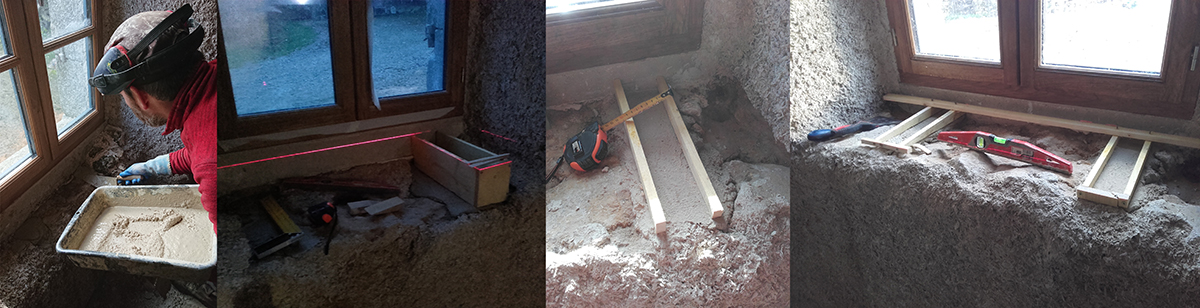 Après avoir mesuré la différence de niveau à rattraper, Gwen a commencé la fabrication des boites/banches dans lesquelles nous allons couler du béton qui permettra de visser les tablettes, autour nous coulerons un mélange de chaux/chanvre, comme nous l’avons fait pour les retouches d’isolant.