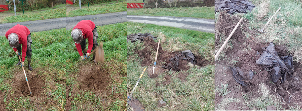 Nous avons, le premier week-end, planté les deux châtaigniers au bord du champ, puis finalement ce week-end, les trois pommiers en attente, en prime du plastique (c’est fantastique).