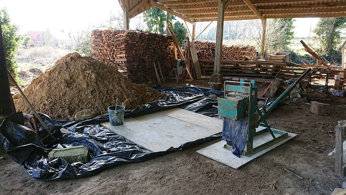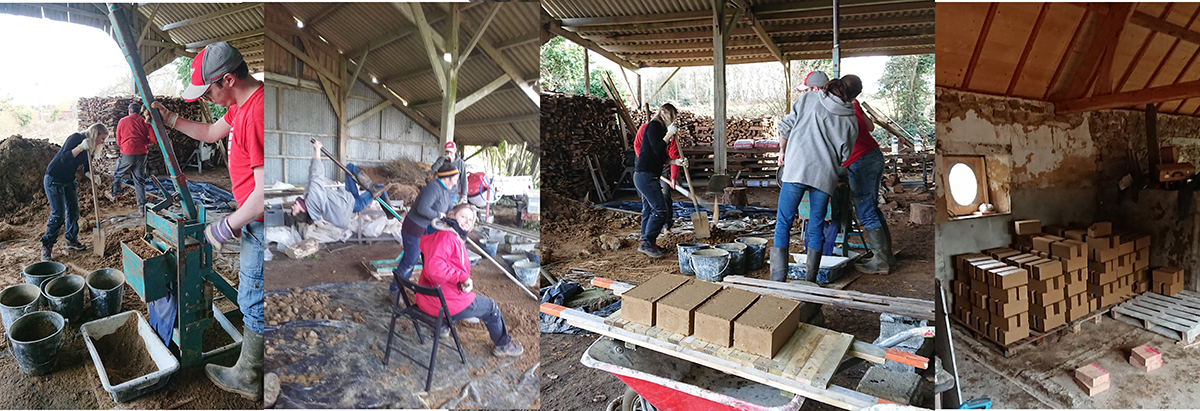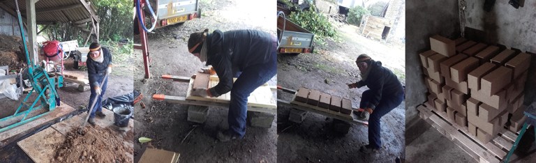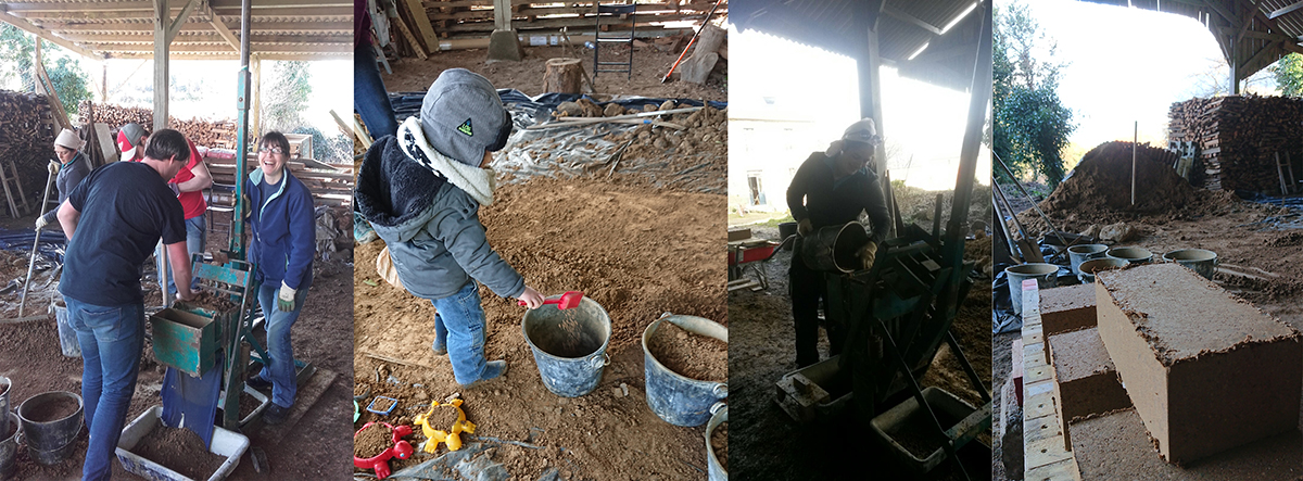 Nous avons ensuite rôdé le parcours de conception : préparation de la terre (image 1), presse de 5 briques à la suite (image 3), rangement des briques dans le haut de la longère sur palettes (image 4).