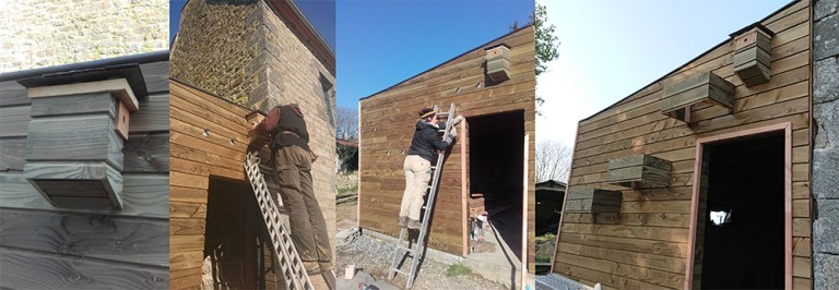 Les barres d’angle du bardage étant posés (image 3), la gouttière presque installée (manque encore la colle, mais attendons une fenêtre météo favorable), ainsi que les deux nichoirs posés (image 2), Gwen s’est lancé dans la confection des bacs à fleurs à poser sur les équerres posées.
