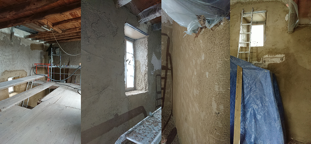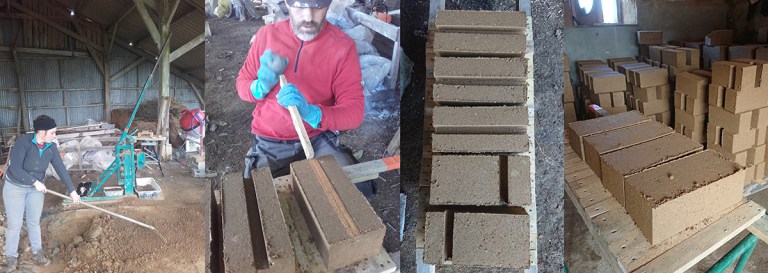 Les briques terminées, nous les laissons dans le haut de la longère en séchage (même par ce temps). Nous pourrons les utiliser après avoir monté la structure des cloisons, quelques semaines après la projection du dégrossis des enduits (on y vient d’ailleurs).