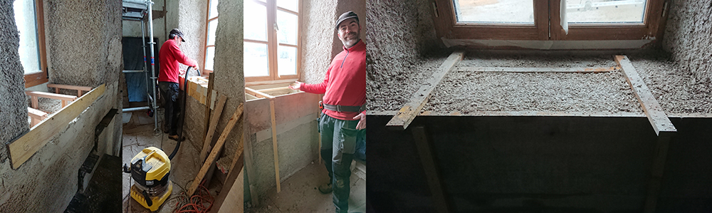 Nous avons effectué des rainures dans lesquelles nous pourrons clipser des morceaux de châtaignier pour ajouter 4,5 cm. Le but est de donner une accroche aux enduits qui seront projetés.