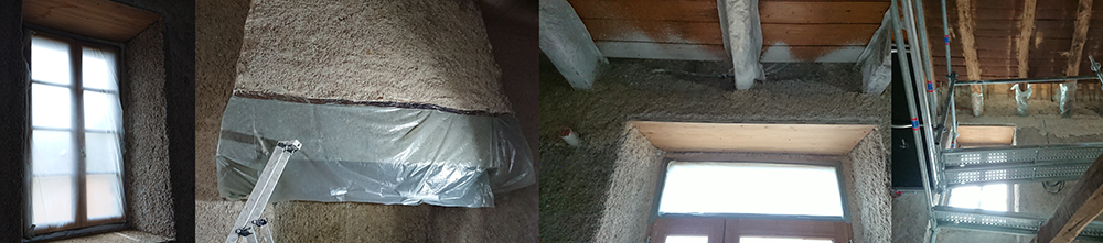Comme cela avait été fait avant la projection de l’isolation, nous avons protégé les fenêtres (image 1), les cheminées (image 2), le départ des solives (image 4).