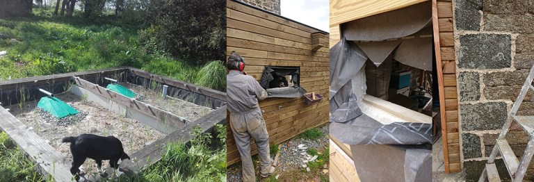 Le lendemain, après une plongée par temps gris, Gw a coulé les rejingots (image 3, une fois dé-banché), alors que j’ai commencé une bande de joint entre le bardage de la buanderie et le bord de la maison, de façon à dans un second temps, venir placer un coin en douglas (image 4).