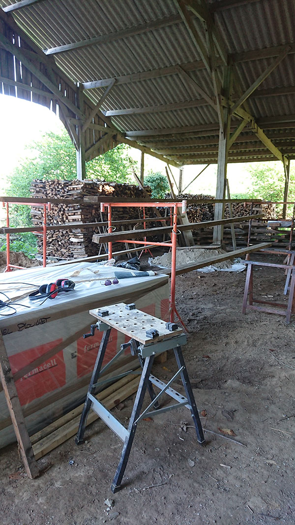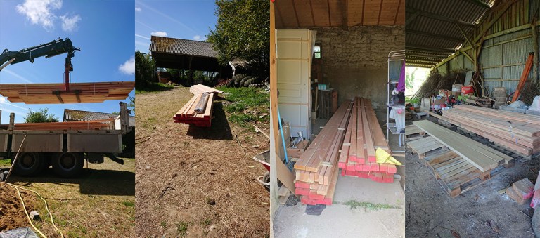 Les longues sections qui serviront à rattraper les niveaux sont dans le bas de la longère (image 3), les sections qui serviront aux poteaux de cloisons sont dans le haut de la longère, les muraillères sous le hangar ainsi que la volige (image 4).