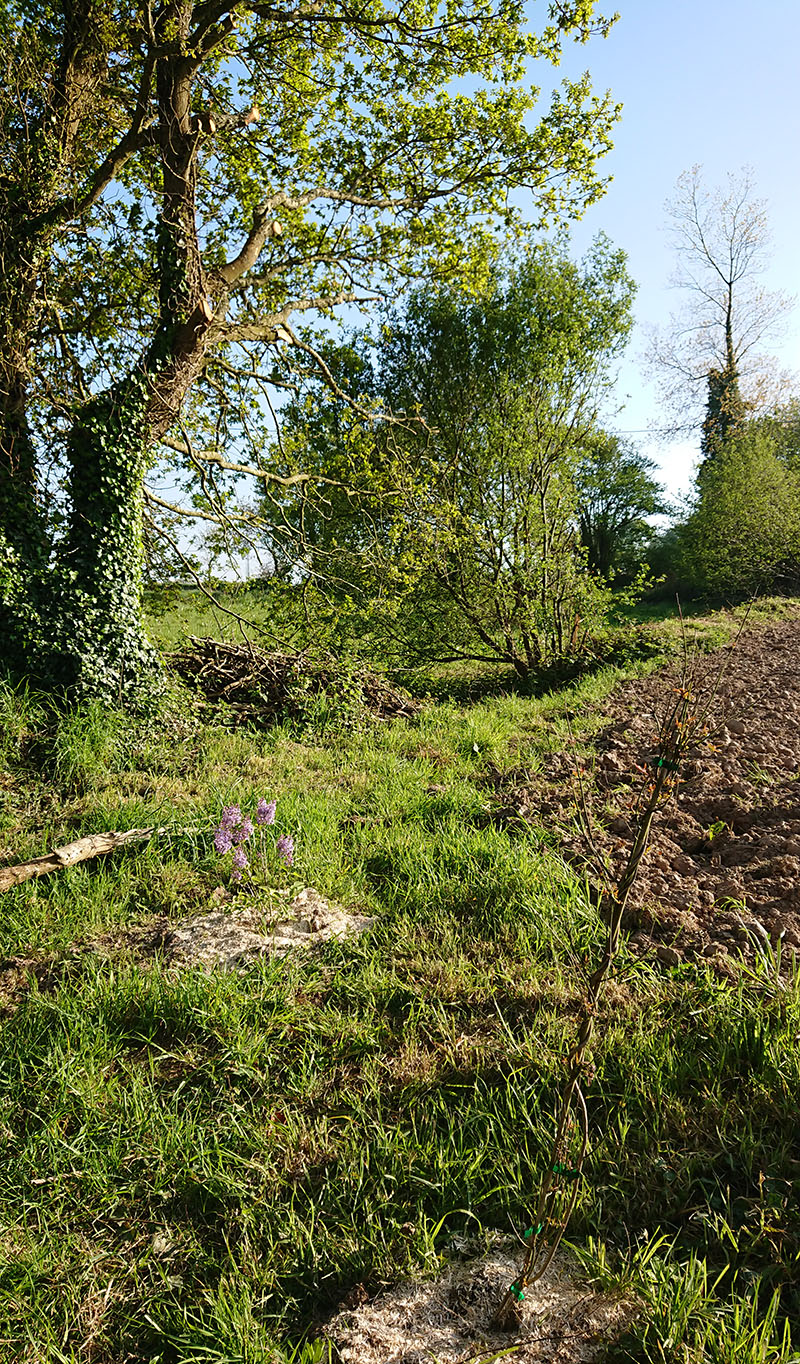 Nous avons continué nos opérations de jardinage en plantant un thym et en débroussaillant autour des pruneliers morbihannais.