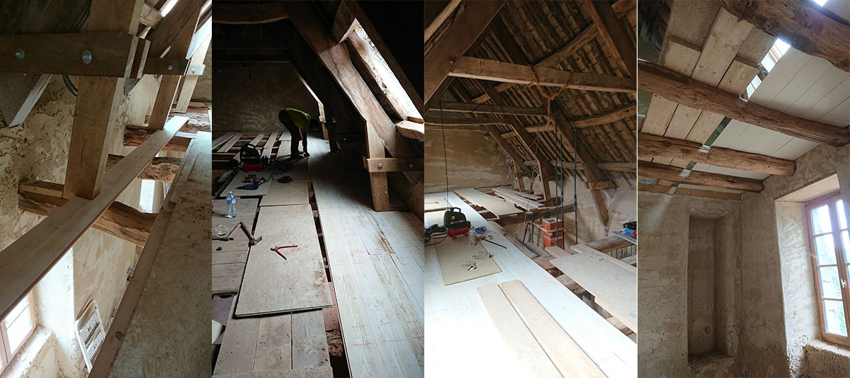 Prochaine étape : peindre quelques planches en plus, car nous écoulons presque notre stock de planches disponibles, puis une fois tout le planché cloué, installer les poteaux pour les cloisons. A cet étage, nous aurons une cloison autour de la trémie et au niveau de la salle d’eau, le reste sera ouvert pour faire une grande pièce.
