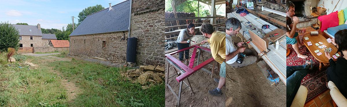 Nous avons commencé par nettoyer l’allée pour les voitures (image 1) de façon à pouvoir garer de côté deux voitures facilement, sans avoir à rouler sur des parpaings ou des plaques de taule. Nous avons ensuite, démonté les portes du champ, pour y placer des grilles temporaire, pendant que nous avons appliqué une première couche de peinture (image 2), Gwen préparait une boite pour le bloc de sel des bestioles au champ.