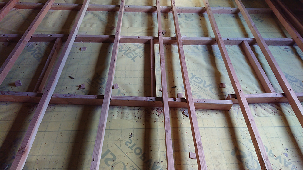 Au premier (images) comme au grenier, les lambourdes et contres-lambourdes sont toutes coupées, posées et vissées.