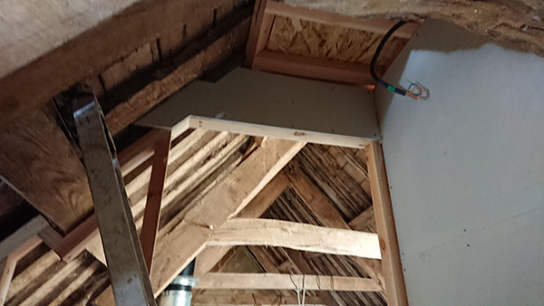 Nous avons ensuite installé un plafond en OSB, qui sera couvert de l’intérieur plus tard pour les finitions (images 3 et 4). Suite à la pose du Fermacell. Nous avons bien fait de nous pencher sur la pose de l’intérieur ! L’espace étant exigu, nous avons eut quelques difficultés à placer les plaques.