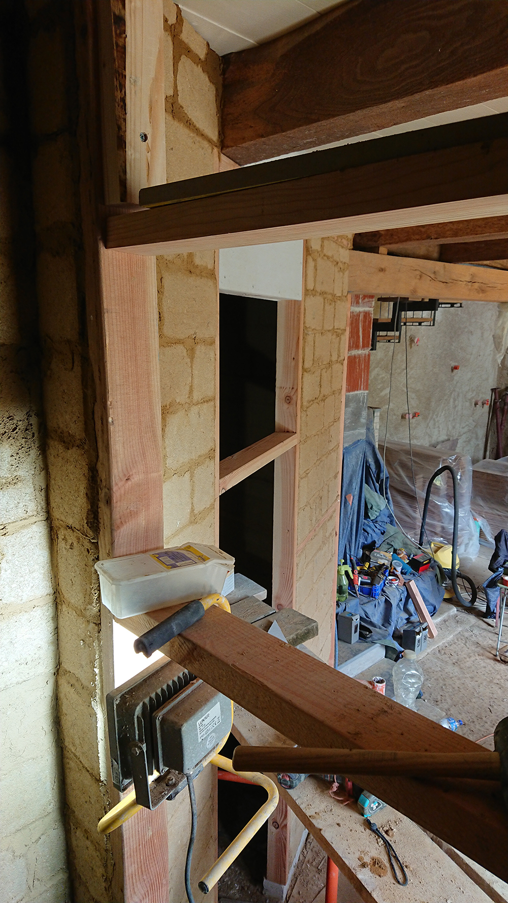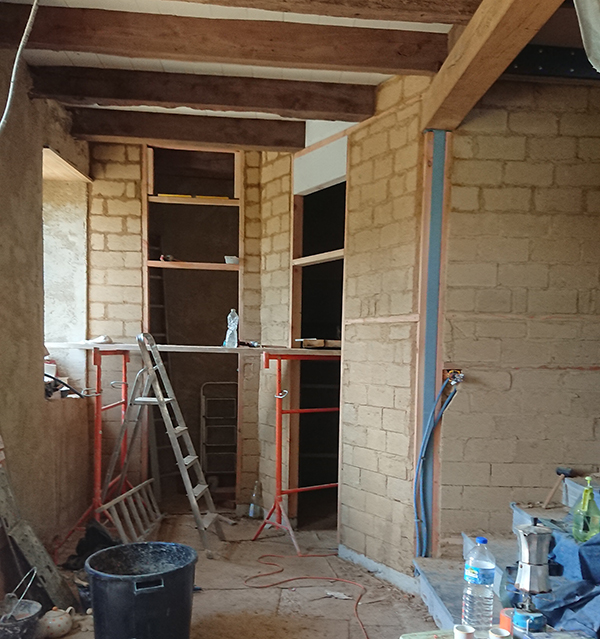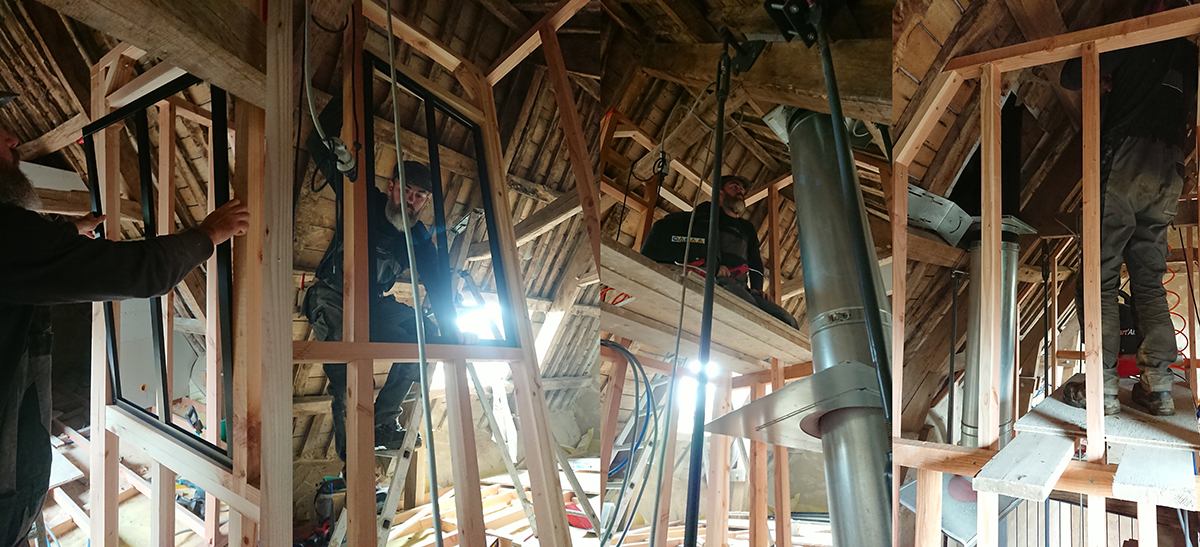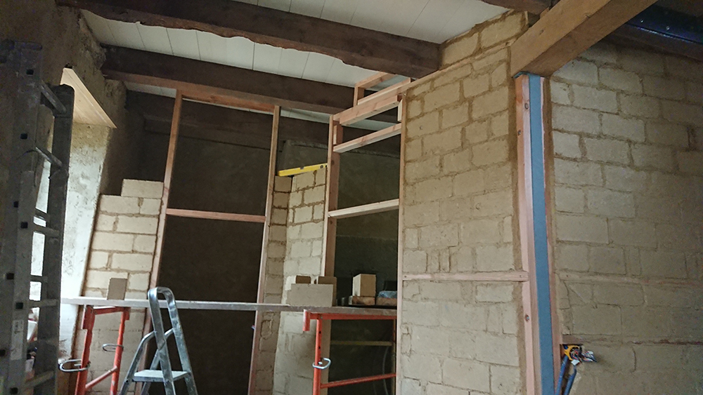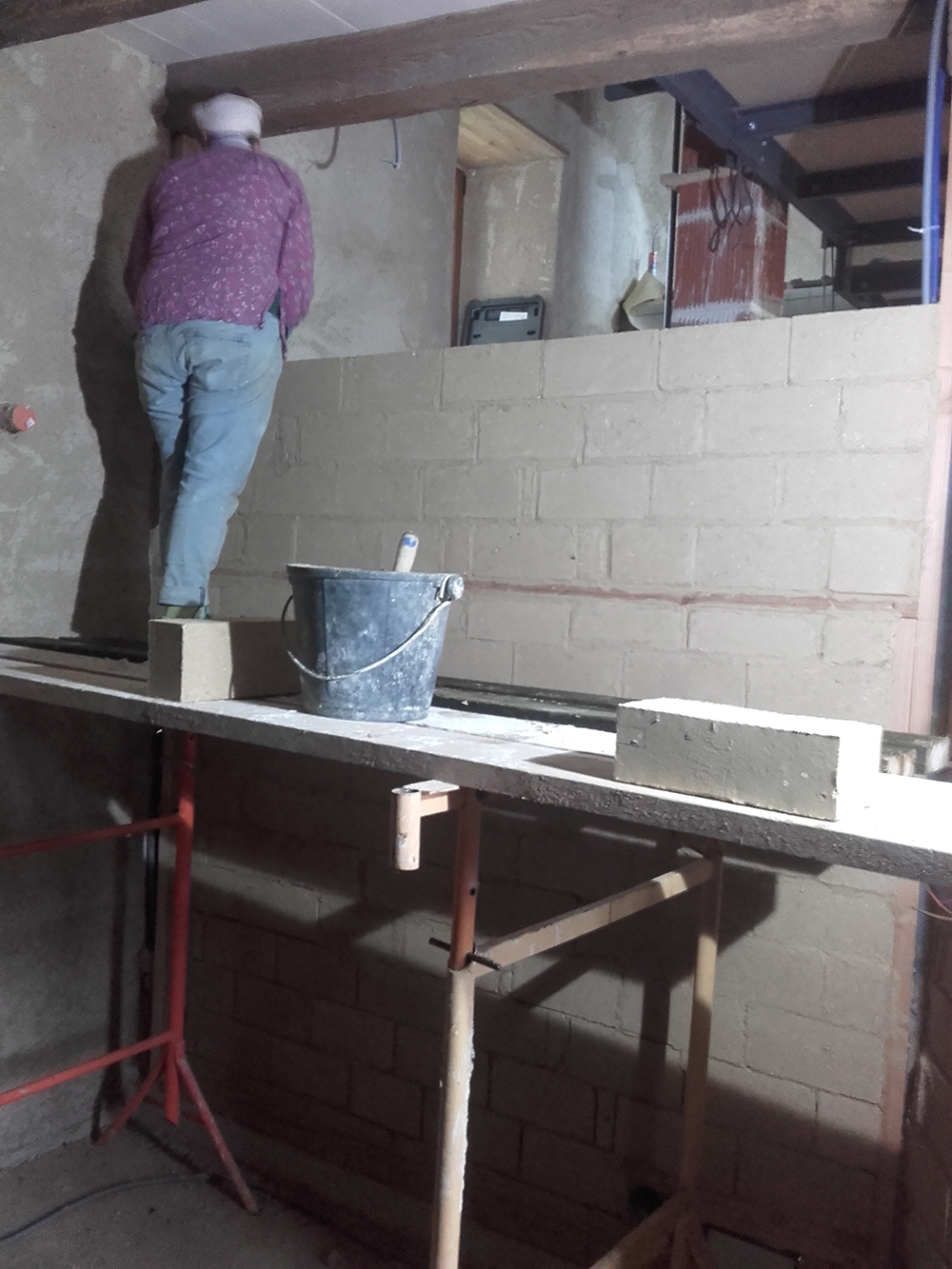 Gwen a installé l’échafaudage qui va nous permettre de travailler par l’intérieur de la trémie pour le caisson autour du conduit de cheminée, comme pour plaquer le fermacell de l’intérieur (images 3 et 4).