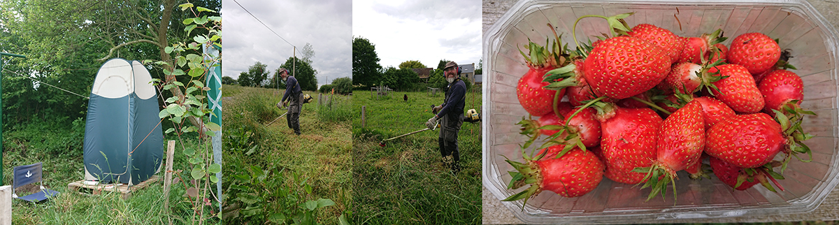 L’été était presque là, nous avons donc installé le camping, enfin sa douche (image 1), mais les températures sont reparties à la baisse. Nous avons toutefois terminé le nettoyage autour du champ (images 2 et 3), le temps de jeter un oeil aux plantations qui entourent les moutons. Paolig lui reprend la pâture côté nord, pour un jour peut-être pouvoir y planter quelques tentes.