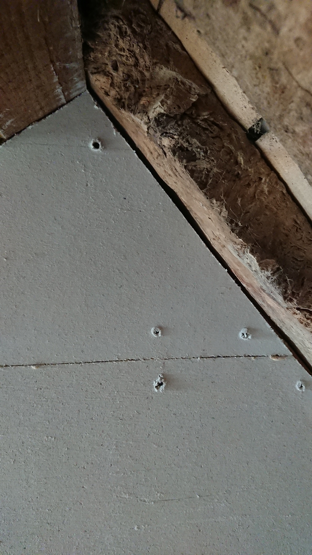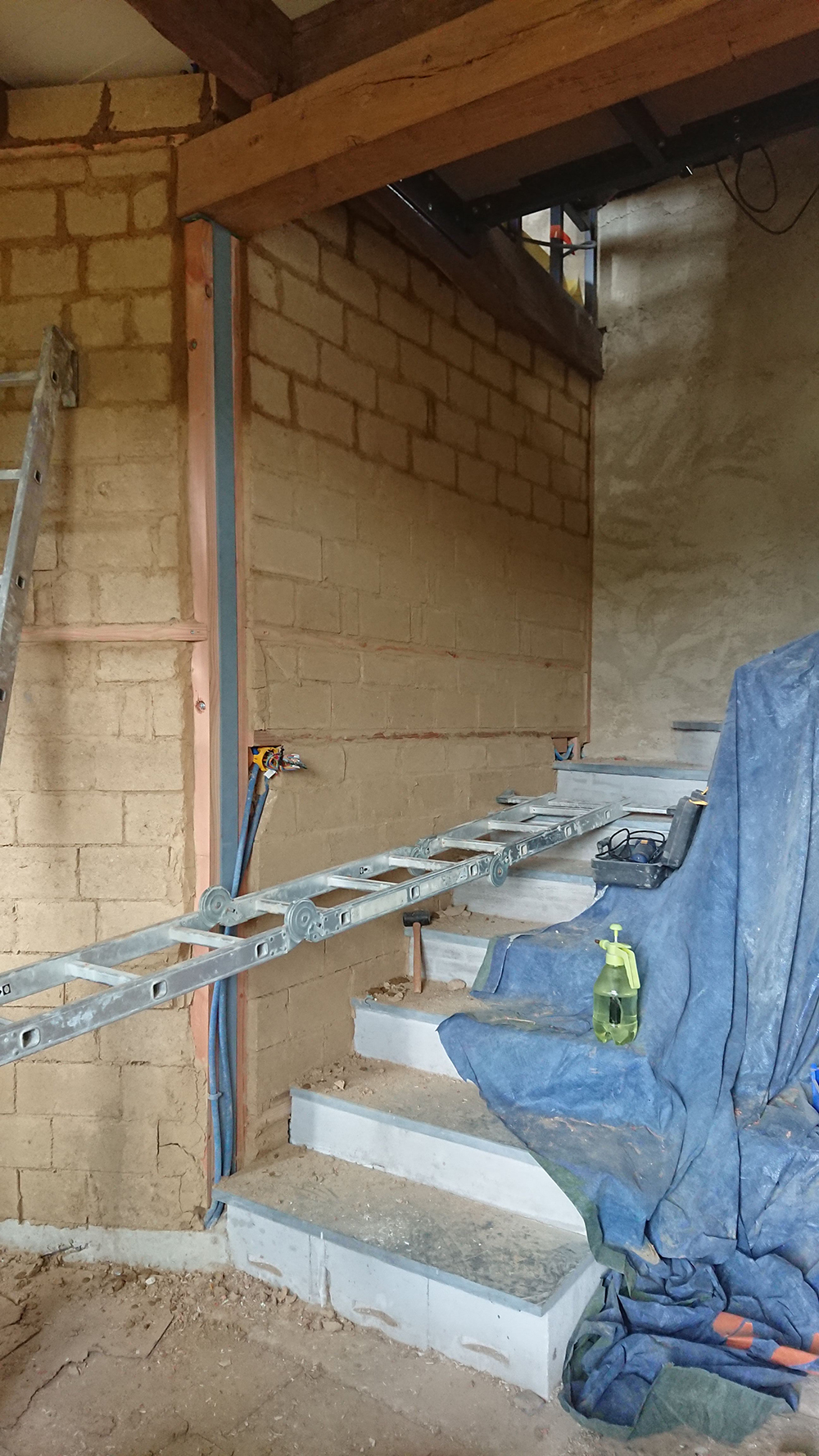 A l’étage, l’échafaudage étant en place, nous allons reprendre le caisson du conduit puis finaliser la cloison autour de la trémie. Nous avons aussi acheté quelques planches de voliges que je dois peindre et qui seront placée en faux plafond pour la salle d’eau et la trémie (pour un résultat identique aux plafonds déjà réalisés).
