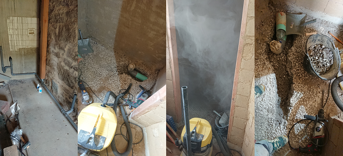 Côté toilettes, après discussion, nous avons suivi les conseils d’Erwan le plombier et j’ai passé une petite journée à creuser la dalle pour déplacer l’évacuation des toilettes humides (qui ne seront peut-être jamais mise en place, mais on ne sait jamais). Travail un peu poussiéreux si on veut (images 2, 3 et 4).