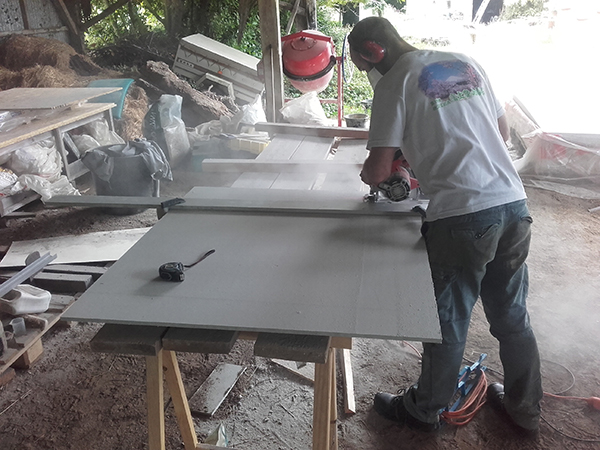 En ciment avec de la fibre dedans, nous avons débanché 2 jours plus tard pour aider au sechage.