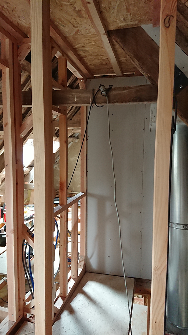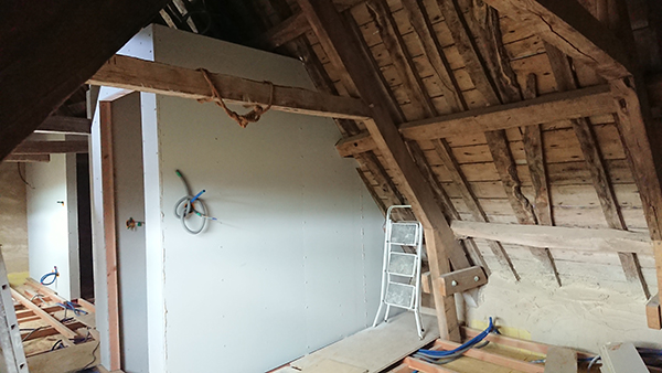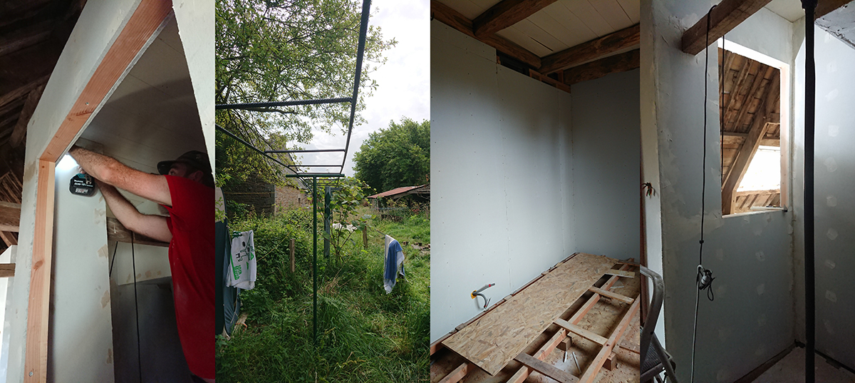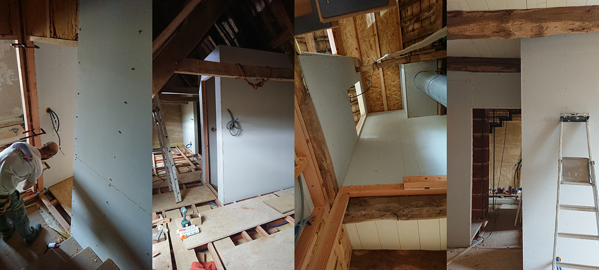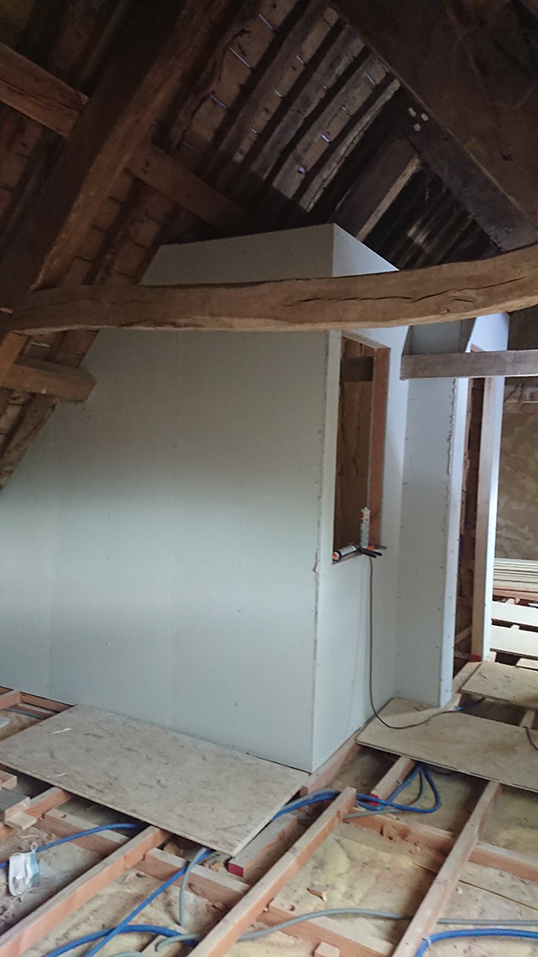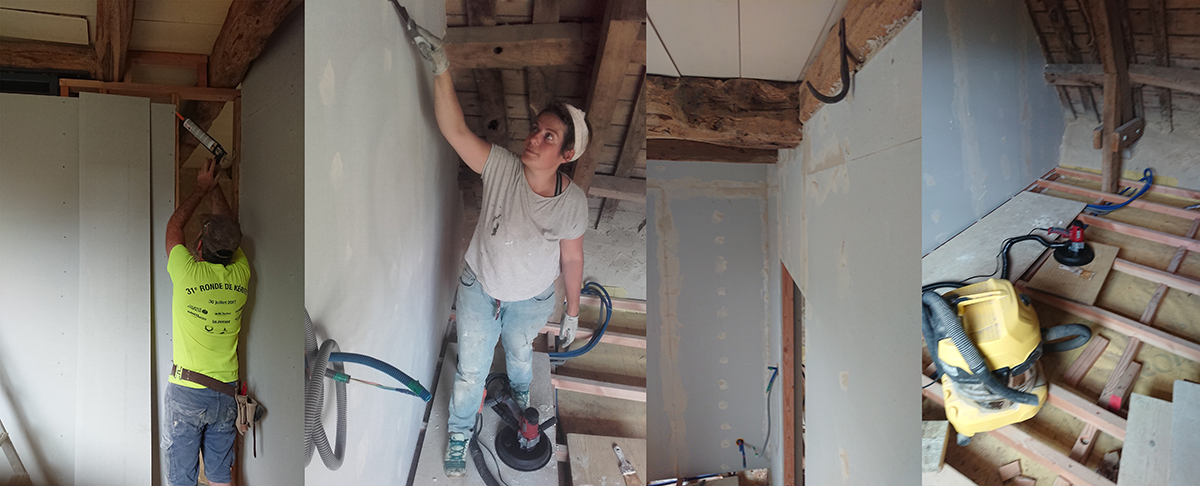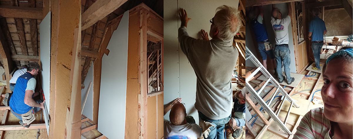 De notre côté, nous avons finalisé les plafonds de la salle de bain du grenier et de la trémie.