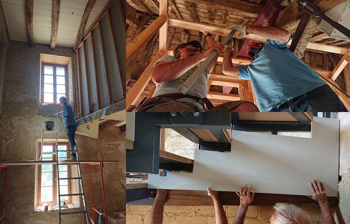 Nous avons alors avancé sur d’autres petits chantiers en attente : électricité dans la buanderie, débrousaillage dans le champ, rangement de bois et d’ardoise pour faire de la place au sable, déménagement d’une commande de chaux et ciment, découpe anticipé de laine de bois, …