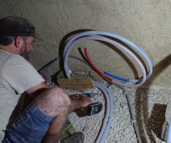 Nous avions prévu de faire couler la chape de la salle de bain. Avant cela nos maçons sont venus jeter un oeil et nous avons commander le matériel nécessaire. Nous avons aussi finaliser la pose des arrivées d’eau au sol pour que les sorties soient les plus nette possible.