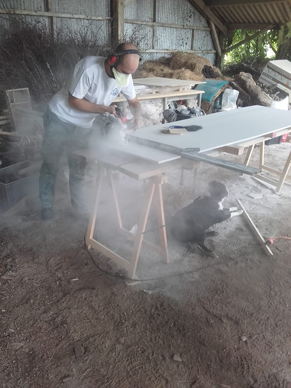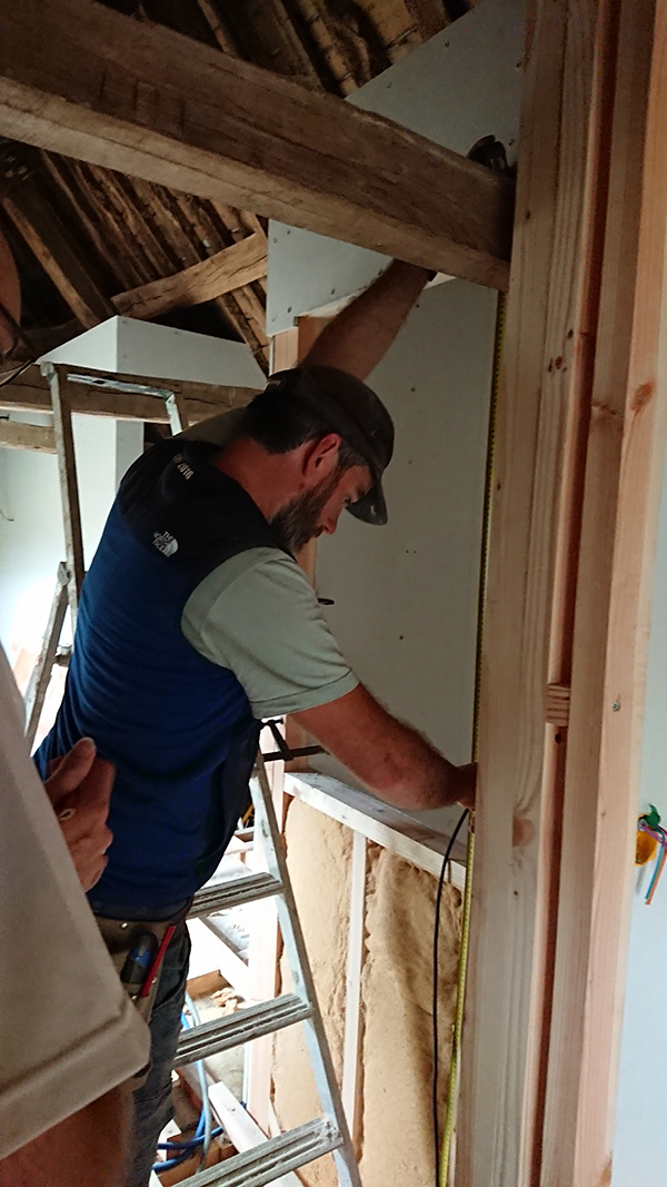 Enfin, nous nous sommes attelés au Fermacell. Cette nouvelle phase du chantier, marque aussi le retour d’Ehoarn sur le chantier.