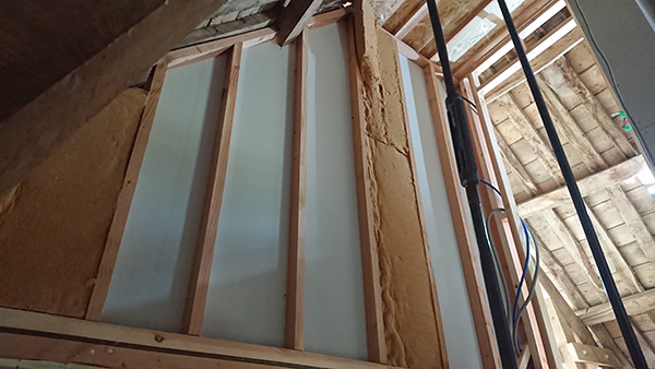 La laine de bois a été placée autant que possible partout où il y avait une face de Fermacell. Dimanche soir, il restait quelques hauts de mur au premier, le haut de la porte au grenier côté escalier, ainsi que deux baquettes le long de la porte et les deux côté d’une petite section à l’extrémité du pallier au premier, proche du vide de la cuisine.