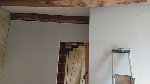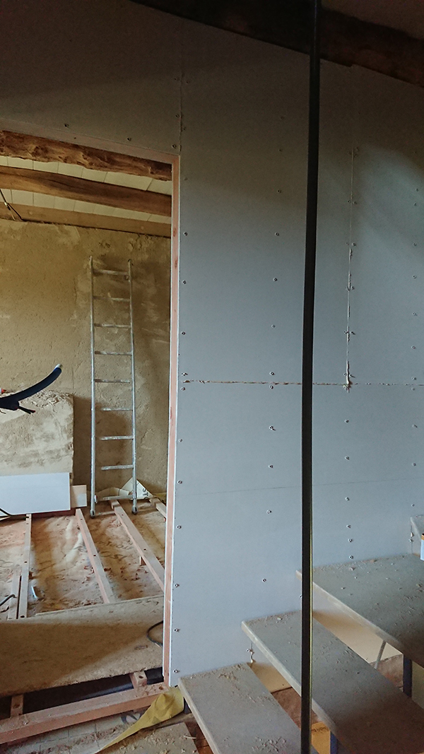Nous avons ensuite repris le Fermacell. Au grenier la pose de la plaque au dessus de la porte ainsi que des barrettes le long (image 1), et au premier le coin de la chambre centrale (image 3).