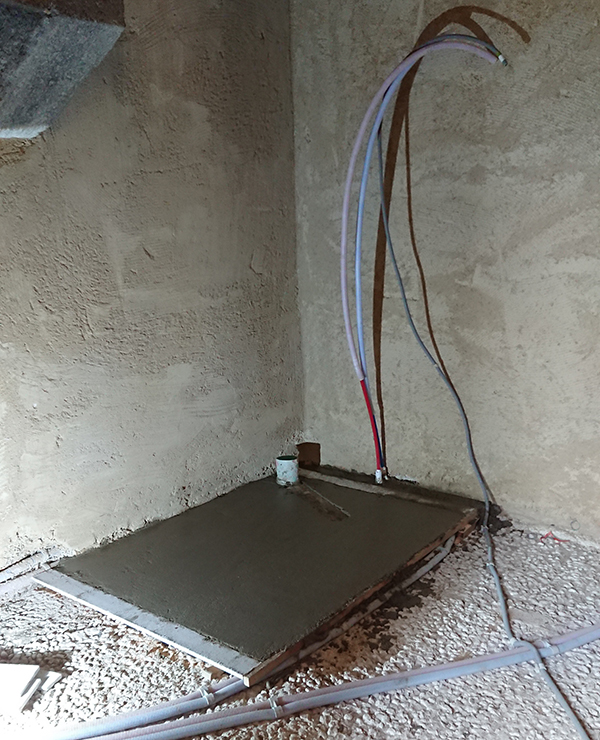 Pendant ce temps là, au rez-de-chaussé, les maçons, après avoir installé les banches, ont coulé la chape pour placer le receveur de la douche.