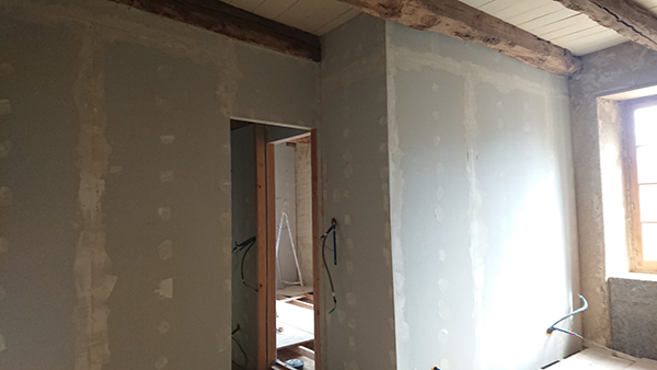 Les enduits de joint sont presque terminés : terminé au grenier et dans la chambre Ouest. Il reste un morceau de Fermacell à poser (image 1), pour venir le lendemain couper la colle, avant de terminer l’enduit de joint (image 2 et 3).