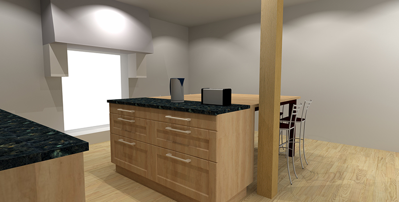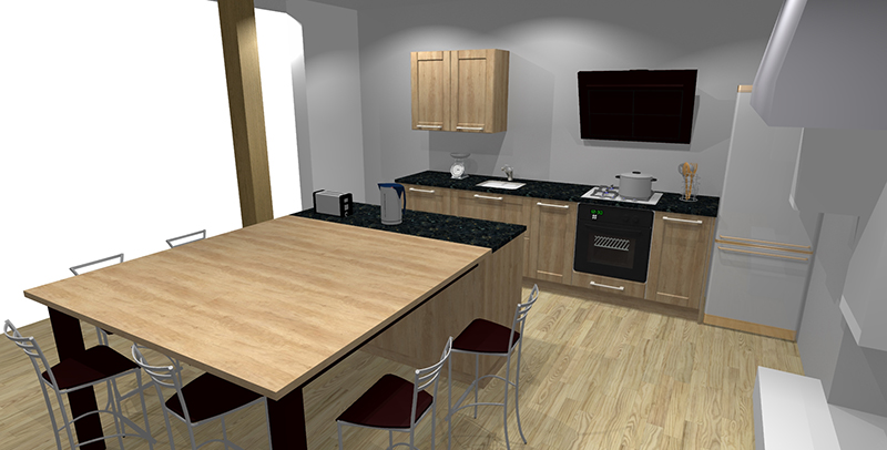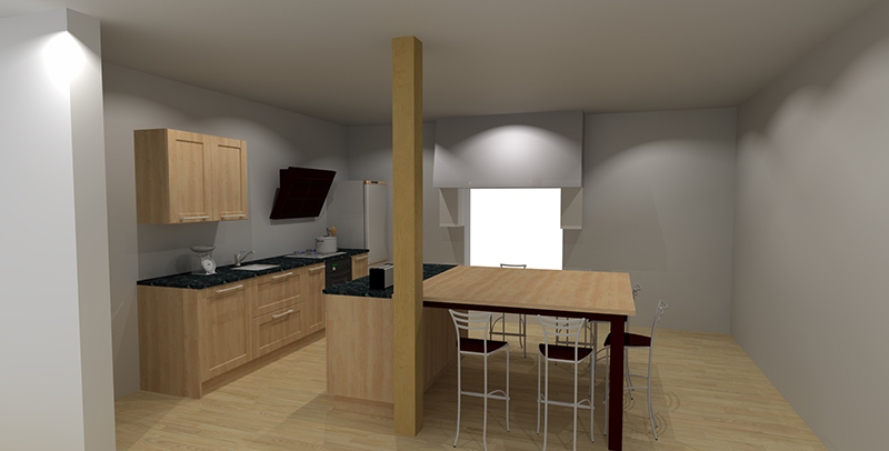Si nous avons bien avancé sur les cloisons, nous avons aussi validé la cuisine. Voici donc en avant première les images 3D de la modélisation.