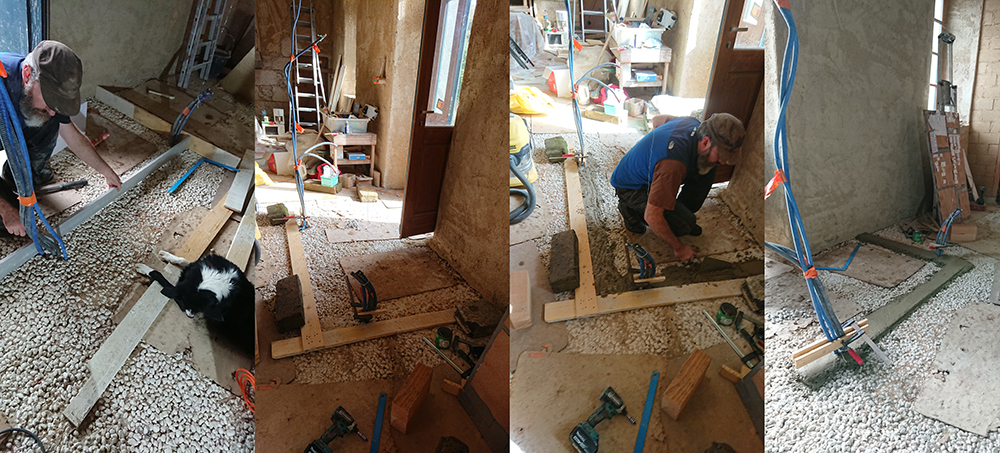 Nous devrons aussi normalement pouvoir attaquer prochainement la salle de bain : carrelage, dégrossis d’enduits terre, cloison de la douche et son étanchéité.