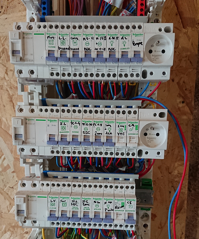 Pour finir, j’ai trié les disjoncteurs pour pouvoir monter le tableau. Quelques liaisons et raccord plus tard, l’ensemble des arrivées a été bloqué dans la goulotte et les câbles branchés sur les bons disjoncteur.