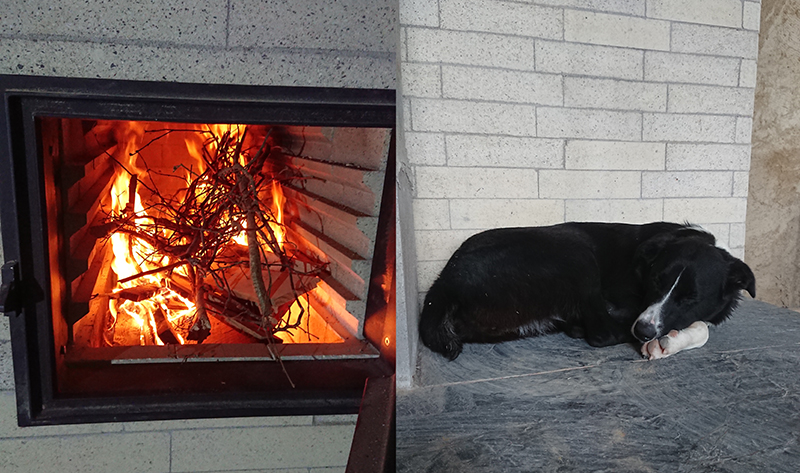 Autre avantage : la banquette et les briques réfractaires, qui gardaient encore de la chaleur le lendemain après midi, offrant une douce chaleur enveloppante dans la maison (21 degrès) et un canapé de choix pour Ourale, qui a très bien compris l’avantage du système.