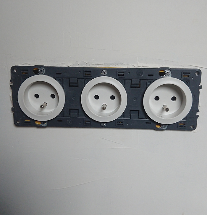 Côté maison, j’ai en parallèle, terminé les raccordements entre câbles ethernet, puis commencé la pose des boitiers et prises dans les cloisons terminées.