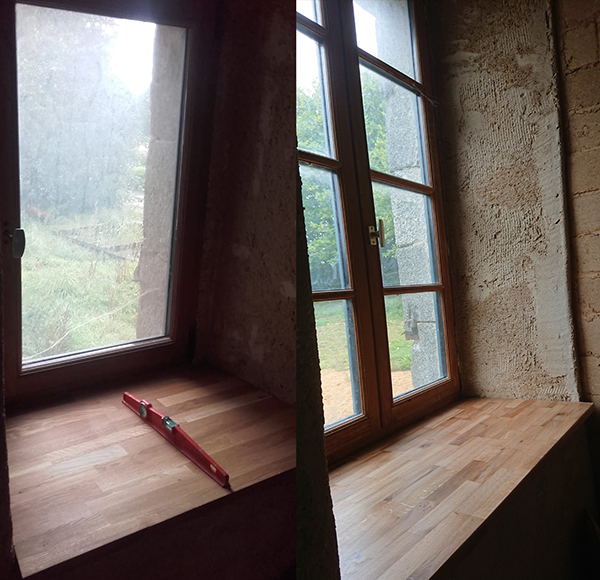 Beaucoup moins rouge qu’avant, la couleur chêne est révélée (image avant/après). Nous pourrons les visser devant les fenêtre et sur la cheminée de l’étage prochainement.