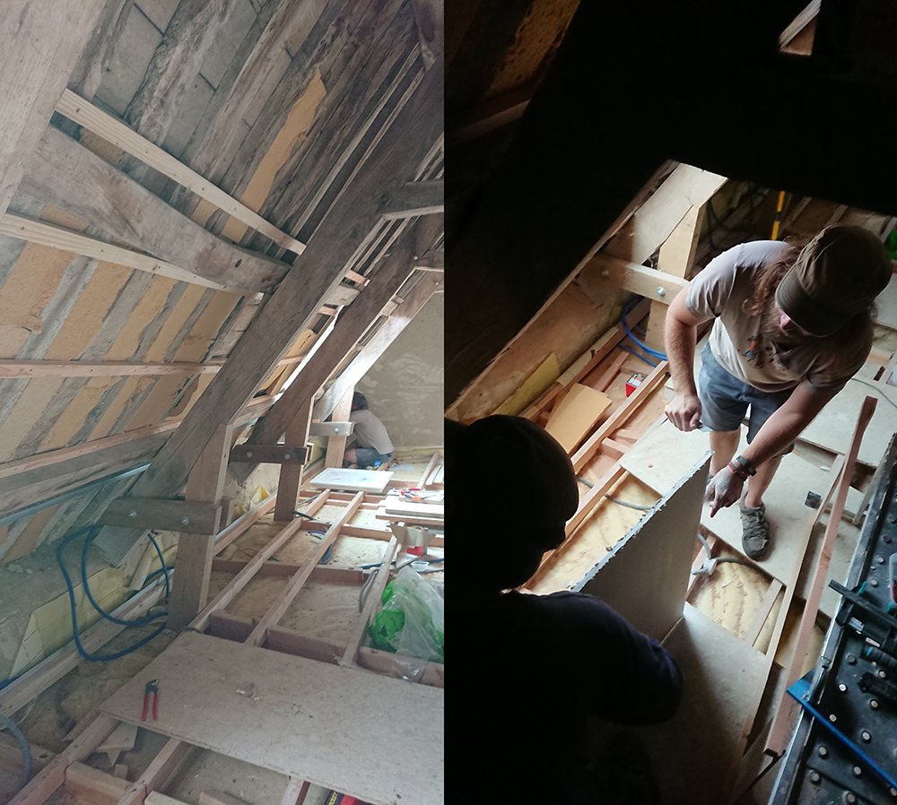 Toutefois, les espaces entre les pannes de la charpente sont loin d’être rectangulaires. Nous avons donc mis en place un cadre pour réaliser les mesures et pouvoir découper au plus proche de la forme voulu.