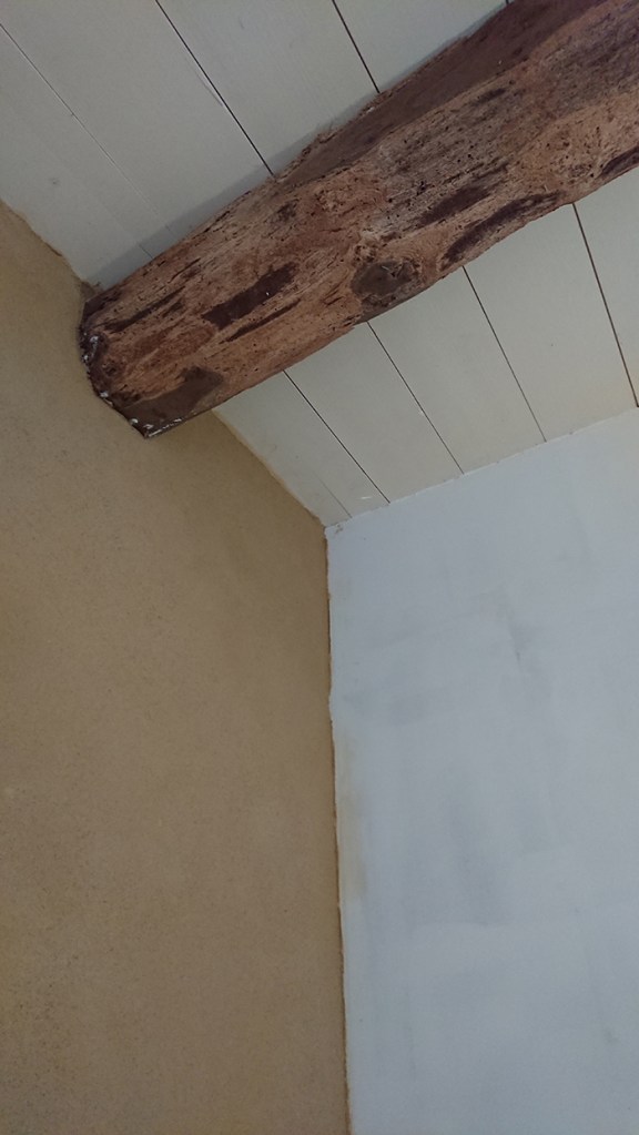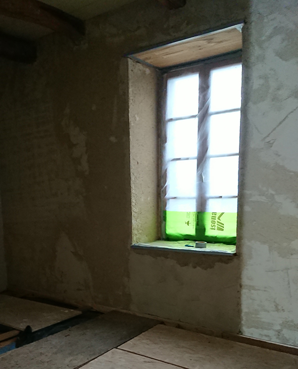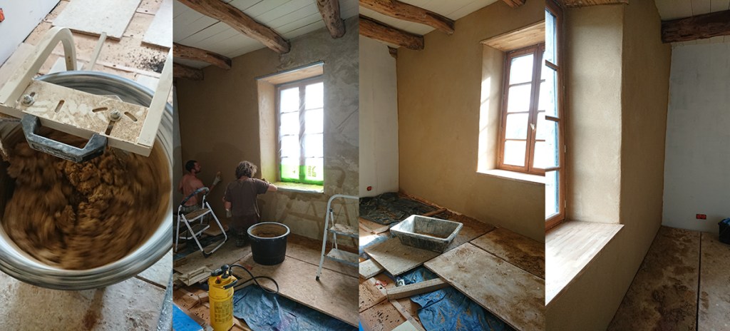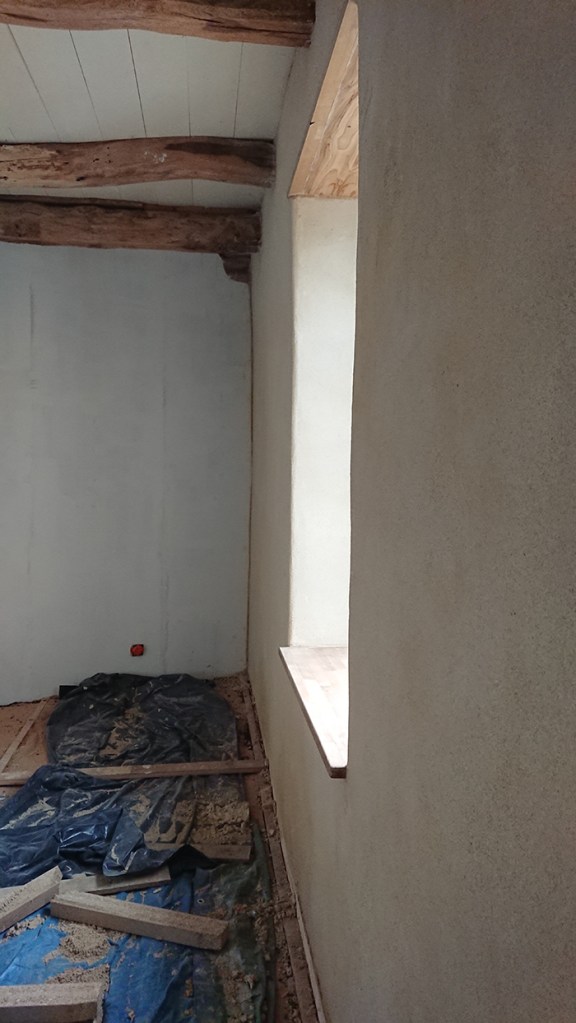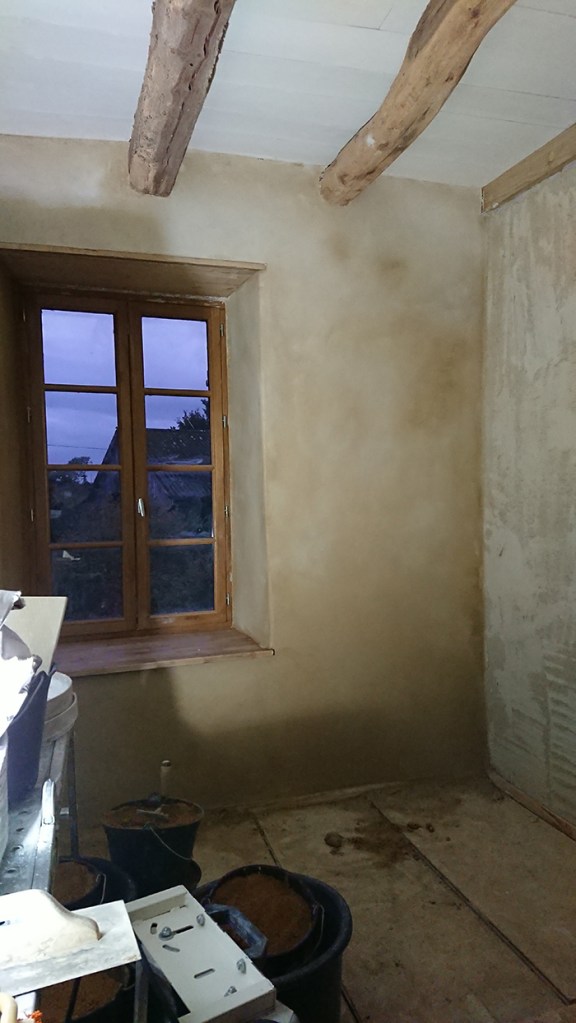 Alors qu’il était normalement temps de rédiger cet article, après quelques jours de pause, nous avons finalement réalisé la 2nd journée d’enduits de finitions dans la chambre Ouest.