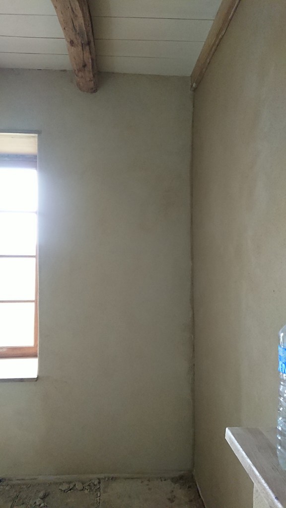 L’état actuel des premiers enduits est très proche de la couleur finale (peut-être un peu plus clair encore). Le résultat est très chaux et lisse. Rien à voir avec les enduits de dégrossis sur lesquels on pouvait voir une trame. L’enduit de finition est terminé avec une éponge pour un rendu souple.