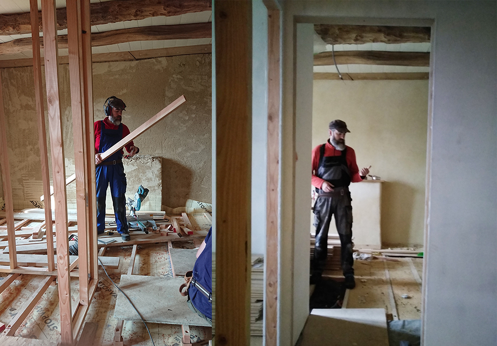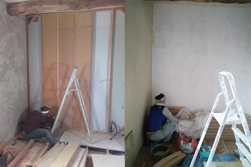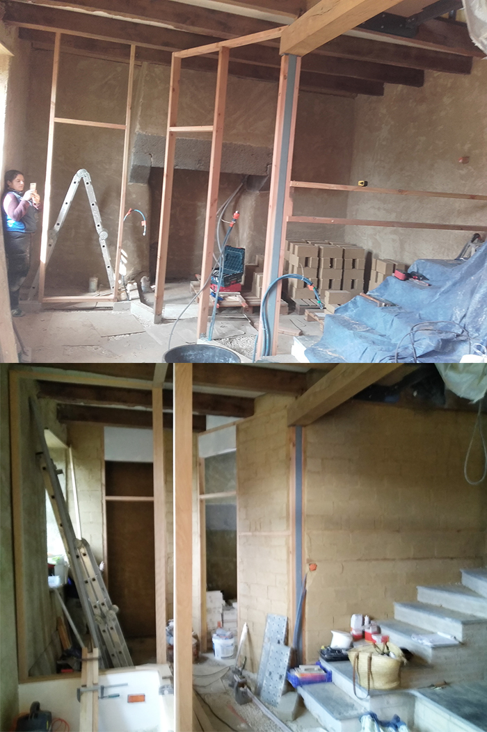 - Terminé la structure bois des cloisons du premier étage et commencé la pose du fermacell et de la laine de bois