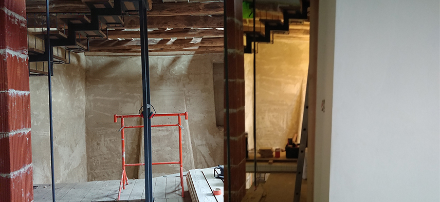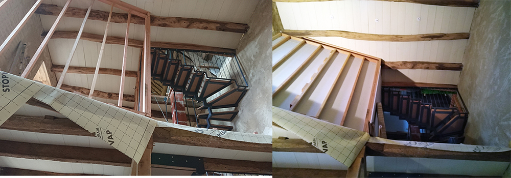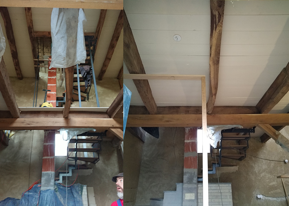 - Terminé de démonter l’ancien parquet au 1er étage et terminé de poser le faux plafond