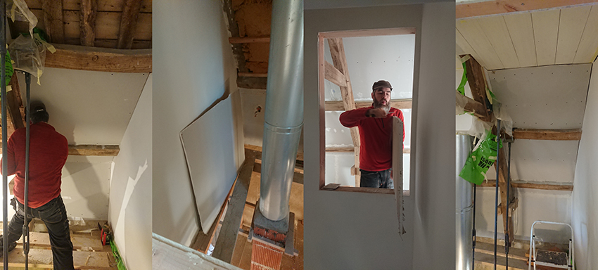 Nous avions plaqué le fermacell sur le bas de la pente. Il nous restait donc les 3 autres grands panneaux et les deux petites bandes en placo à installer.