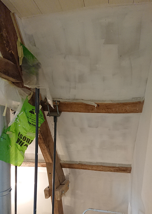 Etapes suivantes : scotchs de protection sur les pannes, rebouchage au joint filler (pour le Fermacell) ou au Map (pour le placo), ponçage du Fermacell, enduits en deux couches et ponçage encore une fois.