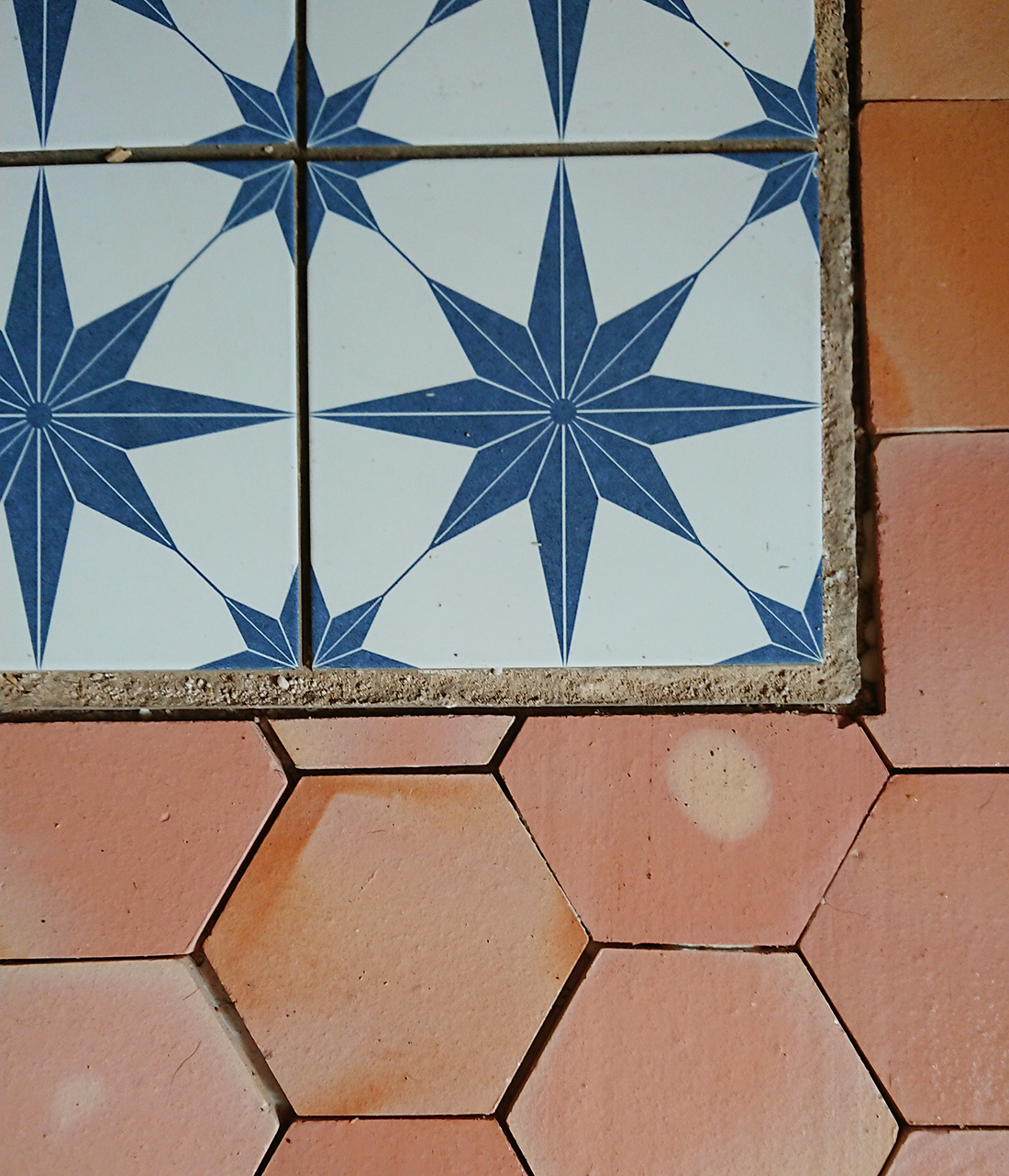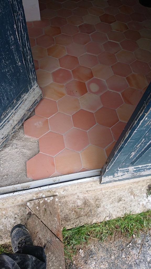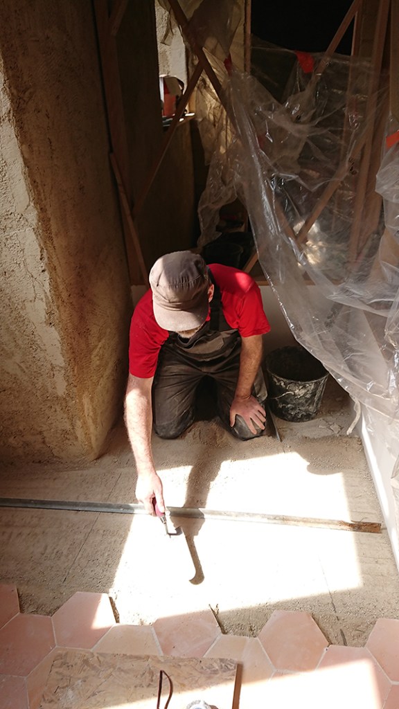 Au fur et à mesure, nous avons continué la pose de la tommette. Dans un premier temps, terminer l’entrée, puis le bas de l’escalier en deux fois. Un ou deux jours après la pose, je viens réaliser les joints, alors que les tommettes sont encore humides mais bien fixées. On peut ensuite déjà marcher dessus.