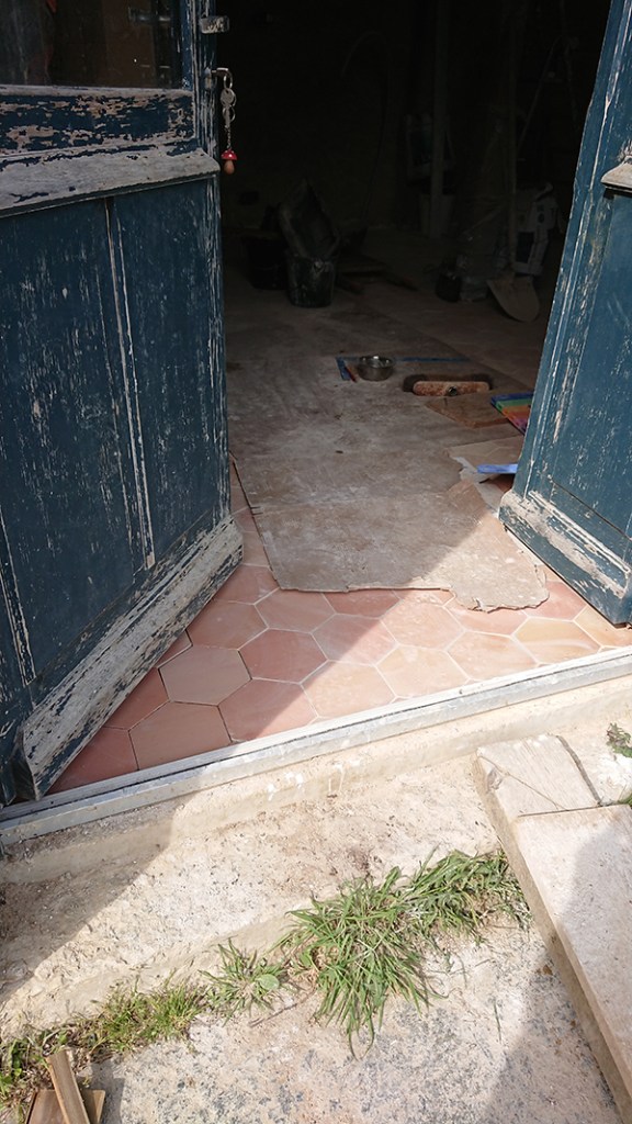 On avance, on avance. Désormais, le premier pas dans la maison se fait directement sur la tommette ! Il nous reste 1,60m à poser entre la salle de bain et les toilettes. Dans l’ordre :