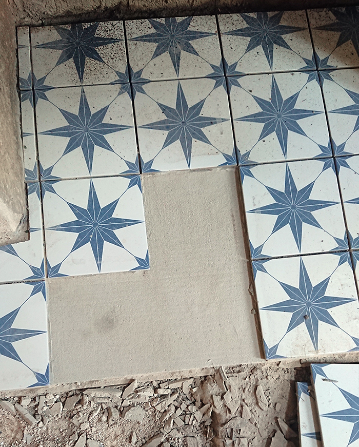 Entre temps nous avions remarqué, que nous étions trompés à la pose des premiers carreaux en installant des carreaux légèrement fêlés.